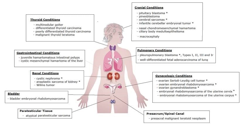 Outros tumores / displasias que podem ocorrer em indivíduos com mutações germinativas do DICER1 incluem tumor de Wilms, neuroblastoma, meduloblastoma e pólipos hamatomatosos juvenis intestinais. A grande maioria dos casos não é causada por mutações DICER1, e a observação de qualquer uma dessas características sozinha em um paciente não é suficiente para sugerir a síndrome DICER1. No entanto, o risco destas condições parece estar aumentado em portadores de mutação DICER1, e o teste genético para mutações DICER1 pode ser indicado se estas neoplasias estiverem presentes no contexto de tumores relacionados com a síndrome DICER1 em outros indivíduos da família.